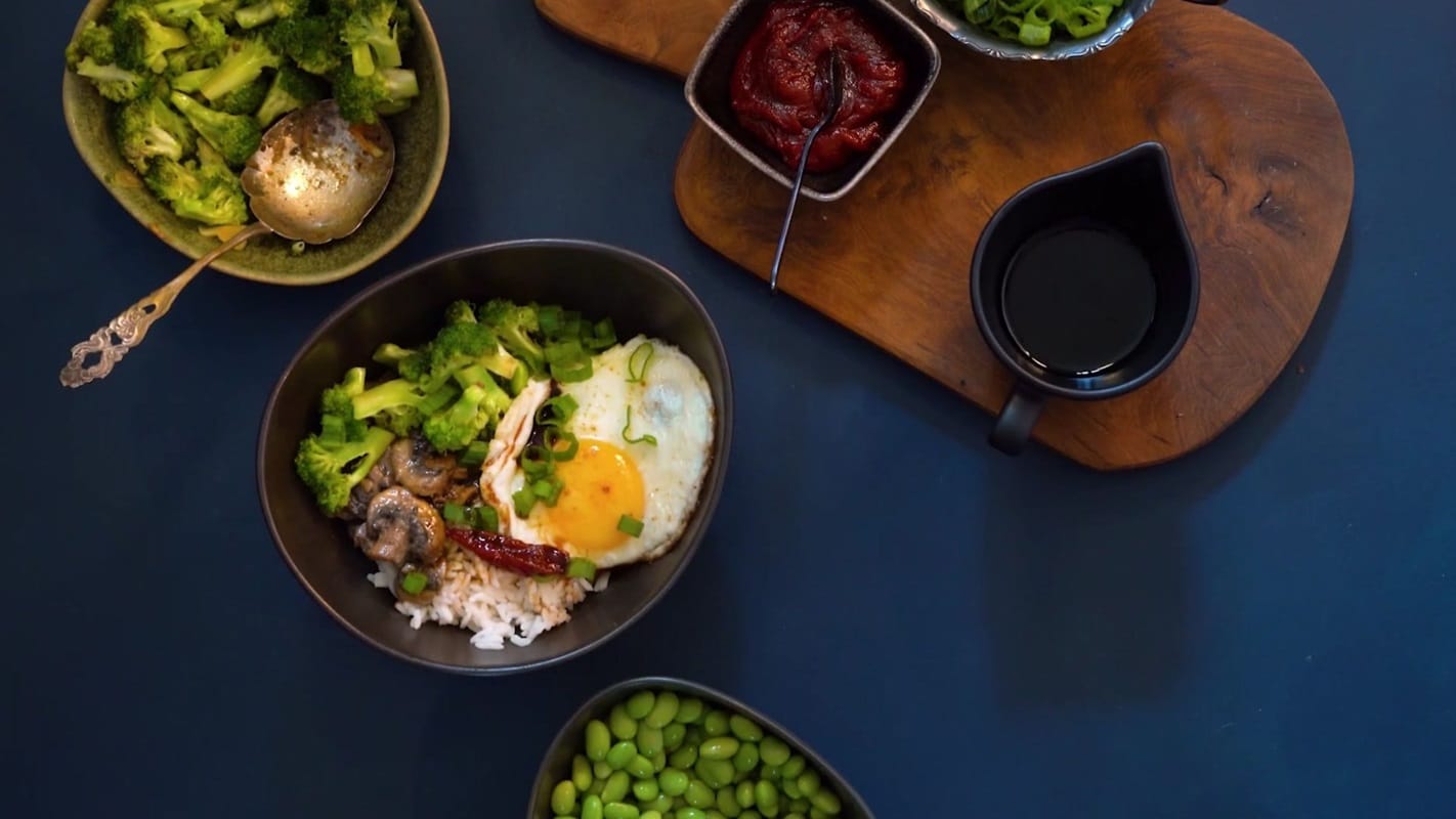 6. Aseta kulhojen pohjalle kypsennettyä riisiä ja sen päälle paistetut sienet, broccolinit ja kananmunat, soijapavut, pilkottu kevätsipuli ja chilitahna. Mausta bowl halutessasi soijakastikkeella.