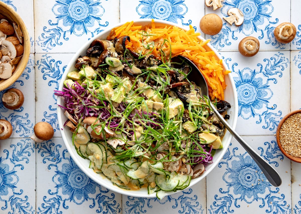 Aasialaishenkinen sienibowl yhdistää paistetut Champ portobellot, sushiriisin ja värikkäät kasvikset raikkaaksi ja täyttäväksi kasvisateriaksi. Seesami–soija-kastike, miso ja pikkelöity kurkku tuovat bowliin syvyyttä ja umamia, tehden tästä helpon ja herkullisen arki- tai viikonloppuruoan.
